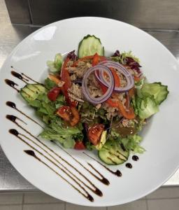Großer, gemischter Salat mit Thunfisch und hausgemachtem Brot